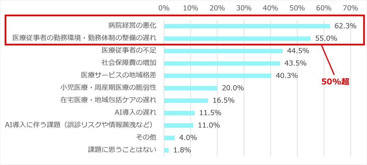 ●日本の医療の未来について課題に思うことの1位は「病院経営の悪化」(62.3%)、2位は「医療従事者の勤務環境・勤務体制の整備の遅れ」(55.0%)(Q2)
