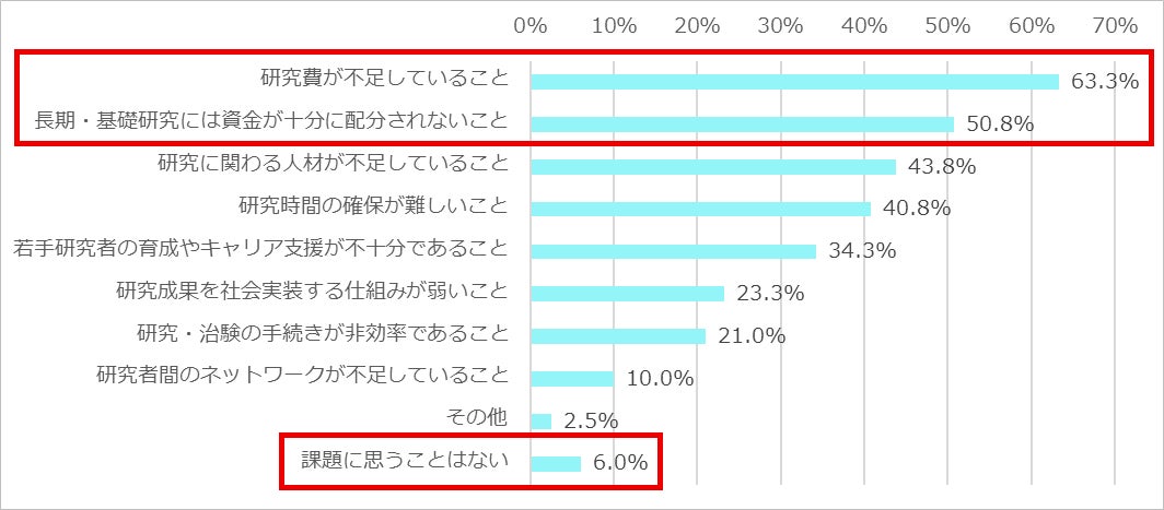 日本の医療研究について課題に思うことについて尋ねたところ、「研究費が不足していること」が63.3%で最も多く、次いで「長期・基礎研究には資金が十分に配分されないこと」が50.8%となった。上位2つはいずれも資金面に関する課題で、半数を超える結果となった。