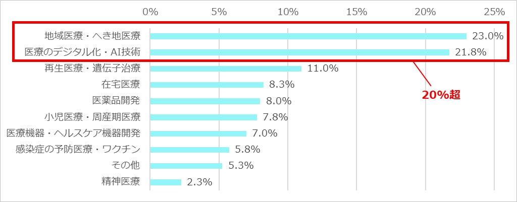 日本の医療において、今後最も重点的に支援・発展させるべきと考える分野について尋ねたところ、「地域医療・へき地医療」(23.0%)と「医療のデジタル化・AI技術」(21.8%)の2項目が、他の項目と比べて突出して高い割合を占めた。3位の「再生医療・遺伝子治療」(11.0%)とは約10ptの差があり、「地域医療・へき地医療」、「医療のデジタル化・AI技術」の支援・発展を医師・研究者は重視していることが分かった。