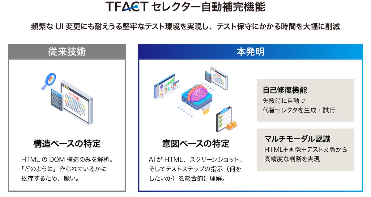 本機能はテストケースとテスト対象を「TFACT」にインプットすることで、AIがテスト自動実行に必要となる具体的なテストステップを自動的に生成します。これにより、従来手動で行っていたテスト準備の作業負荷を劇的に軽減させるとともに、手作業によるミスを無くし、テスト全体の品質と精度の向上を同時に実現します。