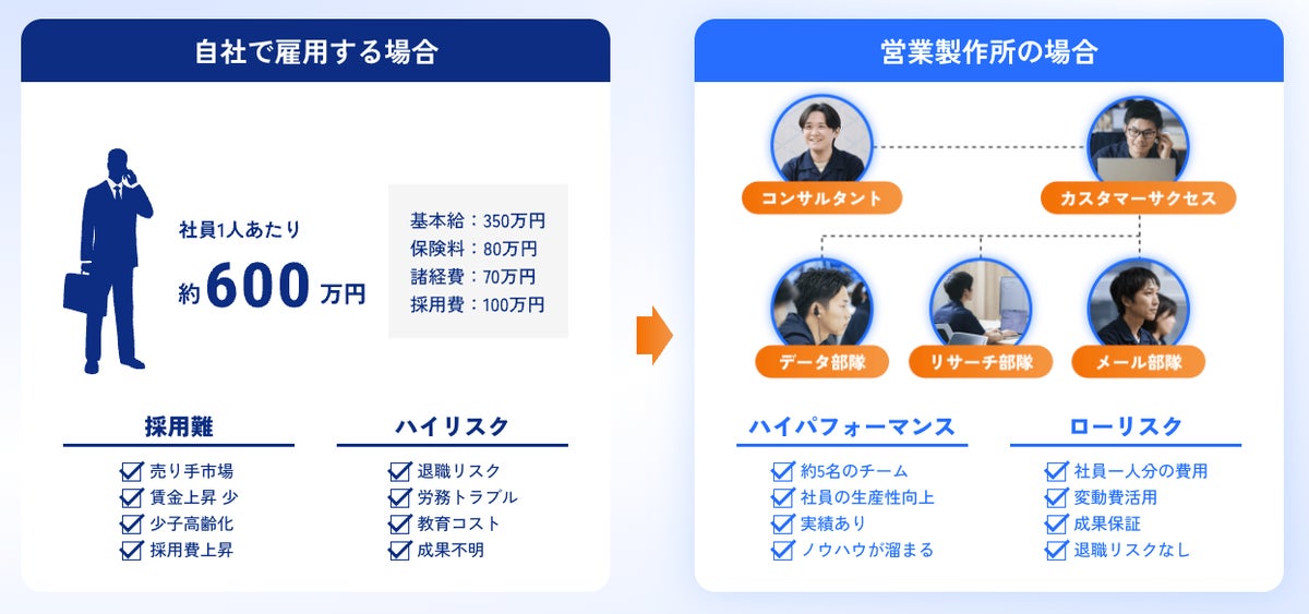 従業員を採用するよりも圧倒的に高いコストパフォーマンスが期待できる点もEigyo Engineの大きな魅力。通常、社員1名あたり約600万円かかり、採用難や退職リスク、教育コストなどのリスクも伴います。Eigyo Engineなら、従業員を1名採用するよりも、低いリスク・高いパフォーマンスが見込めます。