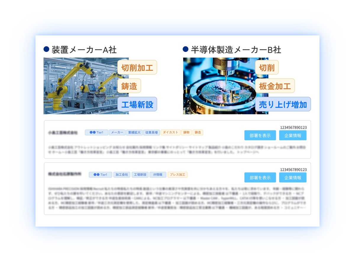 データベースには製造業に特化した180万社の情報を蓄積しており、60万件以上のリサーチタグを活用できます。これにより、業界・エリア・ロットはもちろん、加工方法や材質といった「技術ニーズ」、外注状況や設備投資状況などの「発注ニーズ」まで、より高精度な絞り込みが可能です。