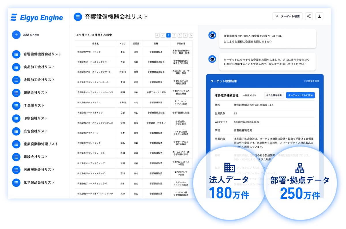 製造業に特化した180万社のデータベース● 法人データは180万件、部署・拠点データは250万件