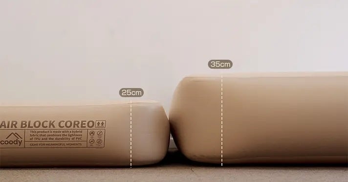 coodyエアブロックCOREOの特長は、バルブ操作のみで空気量を調整できる設計。「硬めマットレス感覚」から「柔らかクッション感覚」まで、