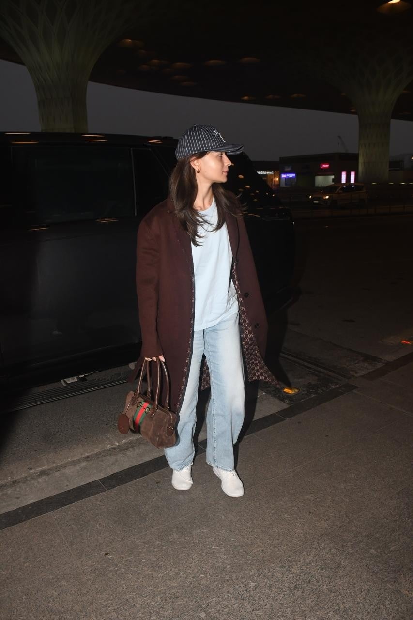 インド映画界で輝きを放つスター、アーリヤー・バット(Alia Bhatt)が2026年2月19日、インド・ムンバイのムンバイ空港にて、グッチのシルク ウール コートを着用し、ウェブ ストライプとホースビット ハードウェアをあしらったダークブラウン スエードの〔グッチ ボルセット〕ボストンバッグを携えて登場しました。