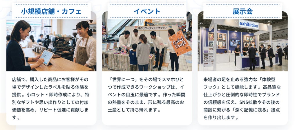 デザインしたラベルはその場でプリント可能です。ユーザーやご購入者をお待たせすることなく商品 をお渡しできるため、満足度の高い購買体験を提供できます。