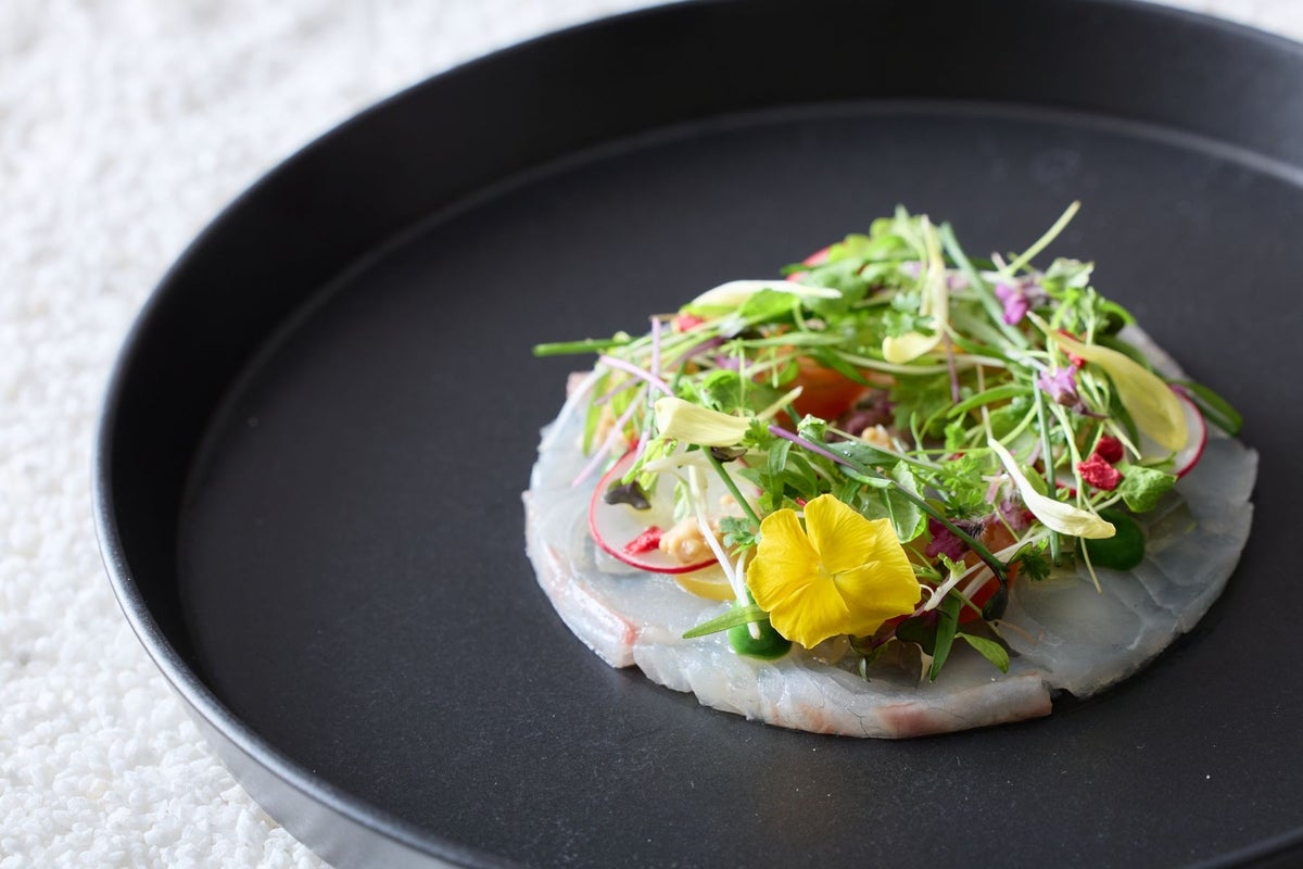 ▲【前菜1.】 桜鯛と愛知トマトのカルパッチョ 緑黄色野菜のクーリ 「がり」のコンディメント