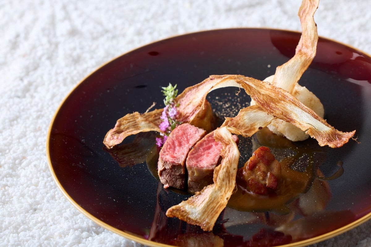 【肉料理】 南半球の仔牛ロースとリードヴォー 長芋のベニエ 実山椒とマデラ酒のソースで