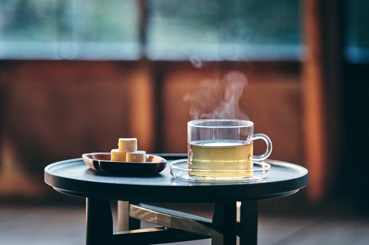 ソムリエが経営する農場で採れたバジルのハーブティーでお出迎え。地域で長く愛されてきた、五島軒の港町情緒あふれるホワイトチョコレートを添えて。