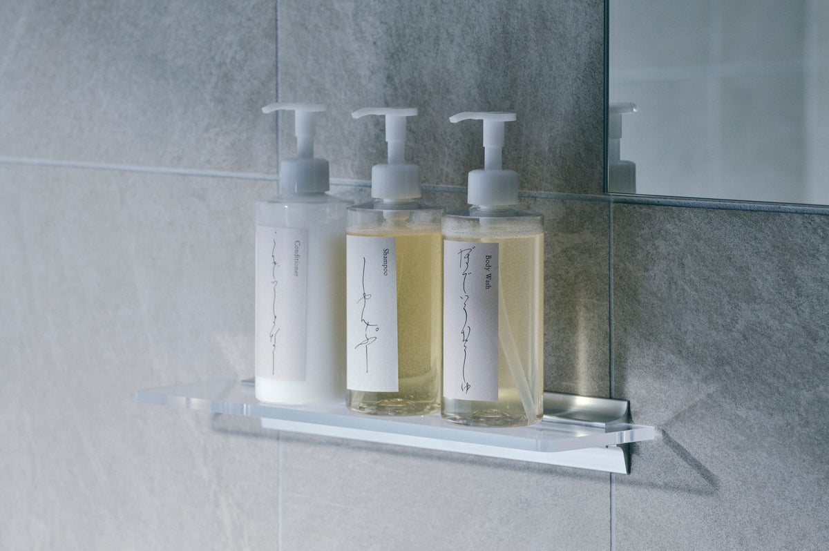 アメニティボトルにもブランドの世界観を反映。「しゃんぷぅ」「こんでぃしょなー」「ぼでぃうぉっしゅ」とやわらかな仮名で表現しています。