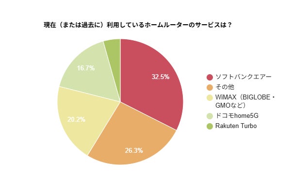 利用しているホームルーターのサービスとしては、「ソフトバンクエアー」が32.5%で最も多い結果となりました。次いで「その他」(26.5%)、「WiMAX(BIGLOBE・GMOなど)」(20.4%)が続いています。一方、「ドコモ home5G」(16.8%)や「Rakuten Turbo」(4.4%)は比較的少数派でした。