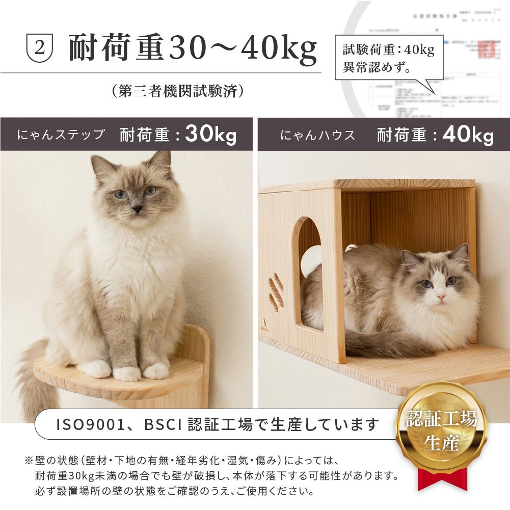 にゃんステップは耐荷重30kg、にゃんハウスは耐荷重40kgの設計。