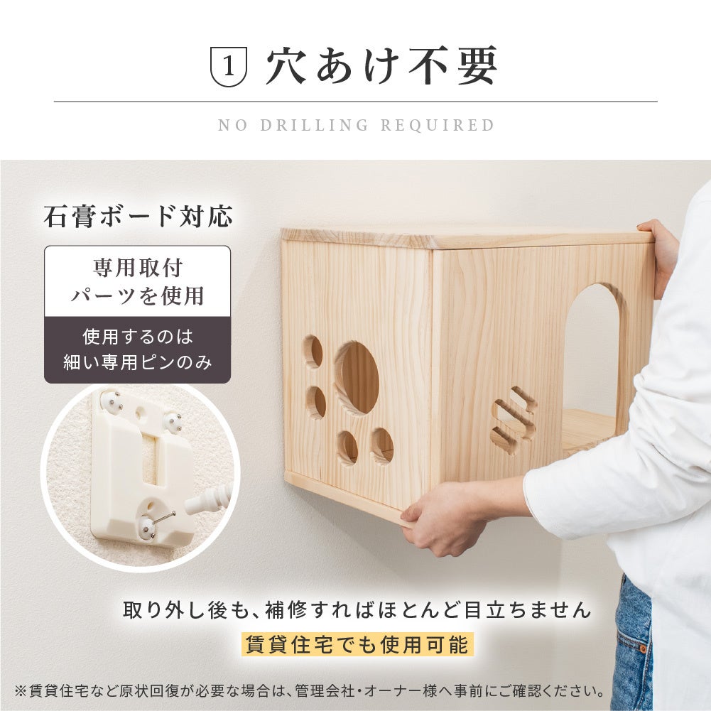 壁への加工を最小限に抑える専用ピン固定や、空間に自然と馴染む木製デザインを採用することで、猫と人が心地よく共存できる住まいづくりを提案します。