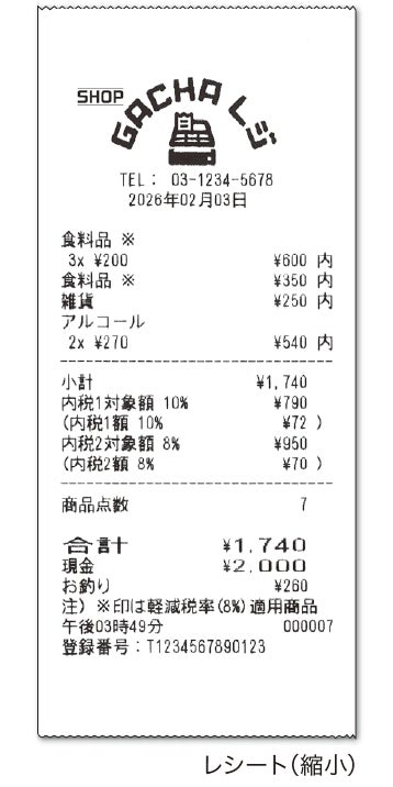 インボイス(適格簡易請求書)に対応。登録番号の入力・印字はもちろん、税率ごとの合計額や税率・税額、軽減税率対象商品の区別(※印字)に対応しており、法令に則ったレシート発行が可能です。さらに、税率の自動変更予約機能も搭載しており、将来の税率変更時にも安心して準備ができます。
