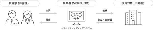 【VERFUND】(以下:ベルファンド)は、不動産特定共同事業法の電子取引業務の認可(または登録)を受ける株式会社ベルテックスが提供する、不動産型クラウドファンディングサービスです。資産運用をしたい投資家から資金を集め、株式会社ベルテックスが運営するベルファンドを通じて不動産運用を行い、運用益や売買益を投資家に分配する仕組みです。