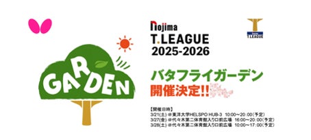 Tリーグでは、2026年3月21日(土)に東洋大学で、27日(金)、28日(土)に代々木第二体育館にて行われる、ノジマTリーグ 2025-2026シーズン プレーオフの会場の外にて、人気のキッチンカーが集合するフードコートや、パブリックビューイング、各種ブースが展開される「バタフライガーデン」を開催します。