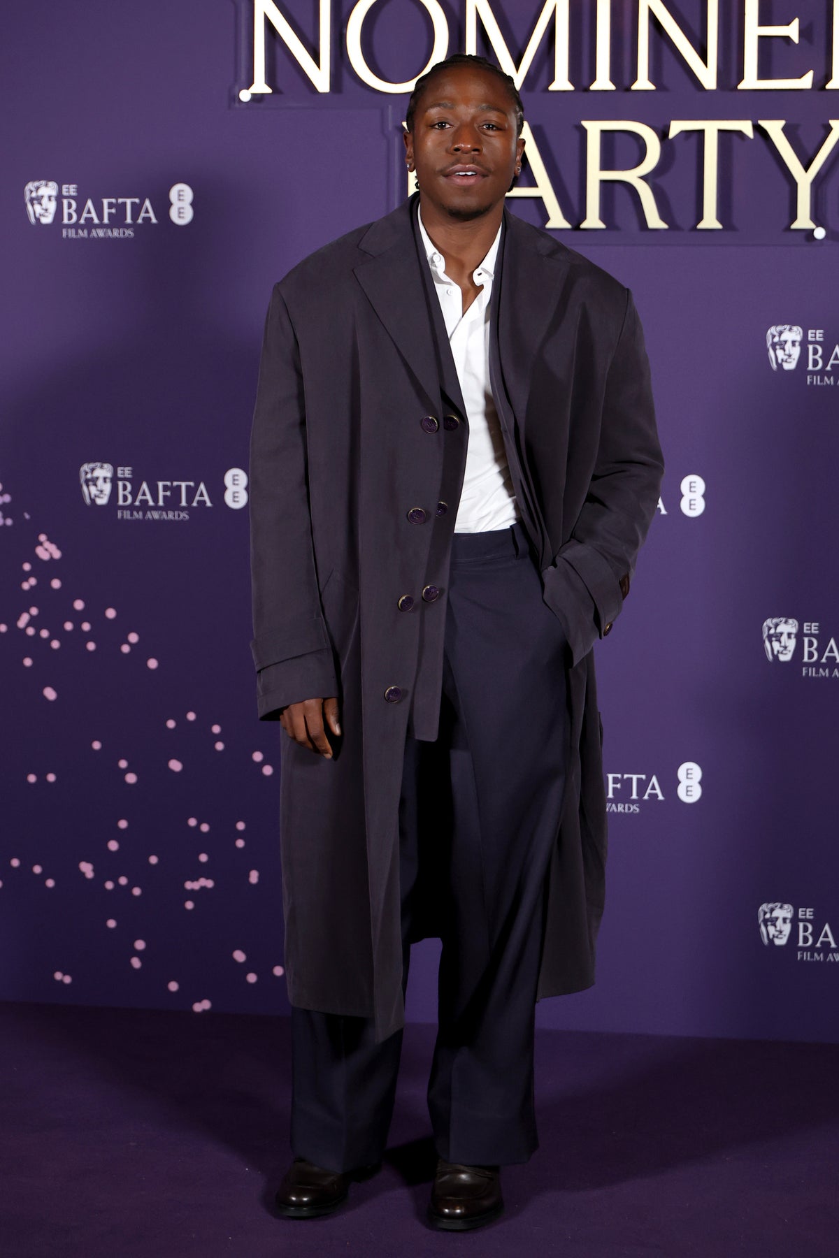 デヴィッド・ジョンソンは、ネイビーブルーの軽量ウールシルク製ベルト付きコートに、同カラーのアンコンストラクテッドジャケットとホワイトシャツ、ネイビーのモヘアパンツ、「LV フレックス ローファー」を合わせました。