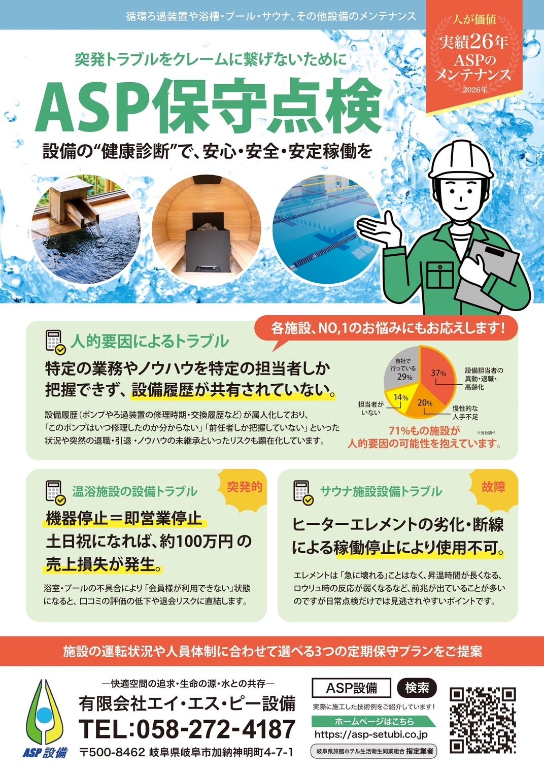 有限会社エイ・エス・ピー設備(本社:岐阜県岐阜市、創業26年)は、サウナ・温浴施設・プール施設の突発的な設備停止を未然に防ぐことを目的とした「ASP保守定期点検プラン」を2026年より本格展開いたします。
