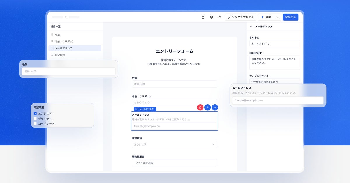 Formeeは、フォームの作成・公開・回答管理を速く、かんたんに行えるWebフォーム作成サービスです。複数選択やファイルアップロードを含む9種類の項目を自由に組み合わせられるため、顧客からのお問い合わせフォームや採用エントリーフォーム、社内向けのアンケートフォームなど、さまざまな用途のフォームを作れます。■Formeeの活用シーン