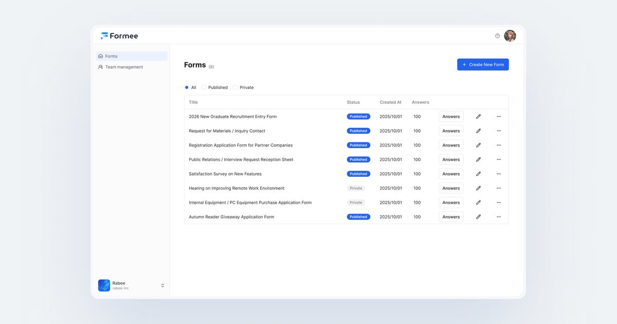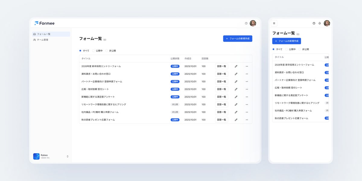 Formeeは、今後も継続的な機能開発や有料プランの拡充を行う予定です。具体的には、フォームに回答があった際のメール通知機能や、フォームに集まった回答データのダウンロード機能など、より多くの人が、より多くの業務で使えるようになるアップデートを予定しています。RabeeはFormeeを通じて、フォーム運用に関わるすべての業務の円滑化を目指します。Formeeに関するお問い合わせはこちら
