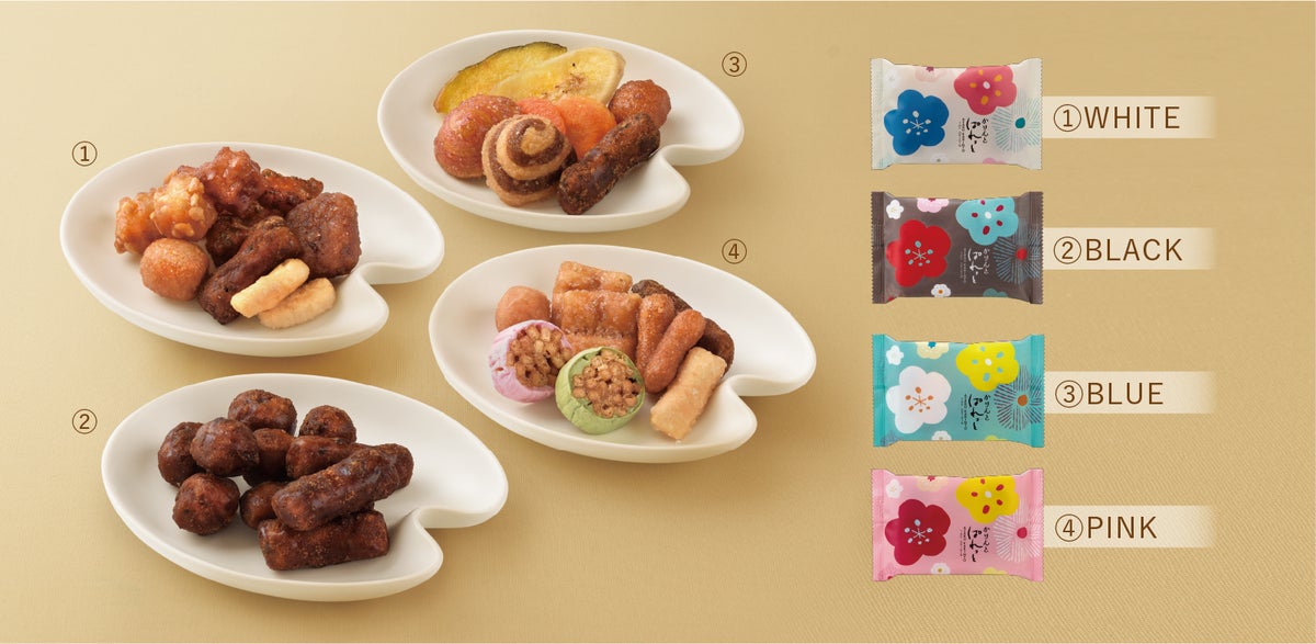 黒糖丸かりんと/カレーかりんと/カプチーノかりんと/りんご丸かりんと/三色あられかりんと/梅鉢かりんと/メープルシュガーかりんと/柚子丸かりんと
