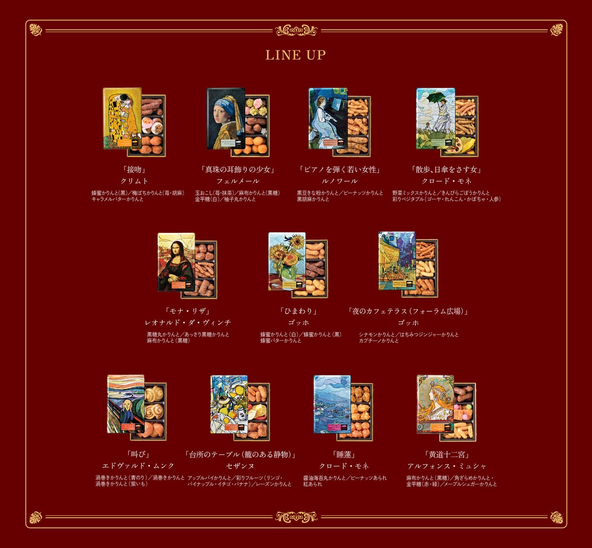 「接吻」(グスタフ・クリムト)内容:蜂蜜かりんと(黒)/梅ばちかりんと(苺・胡麻)/キャラメルバターかりんと