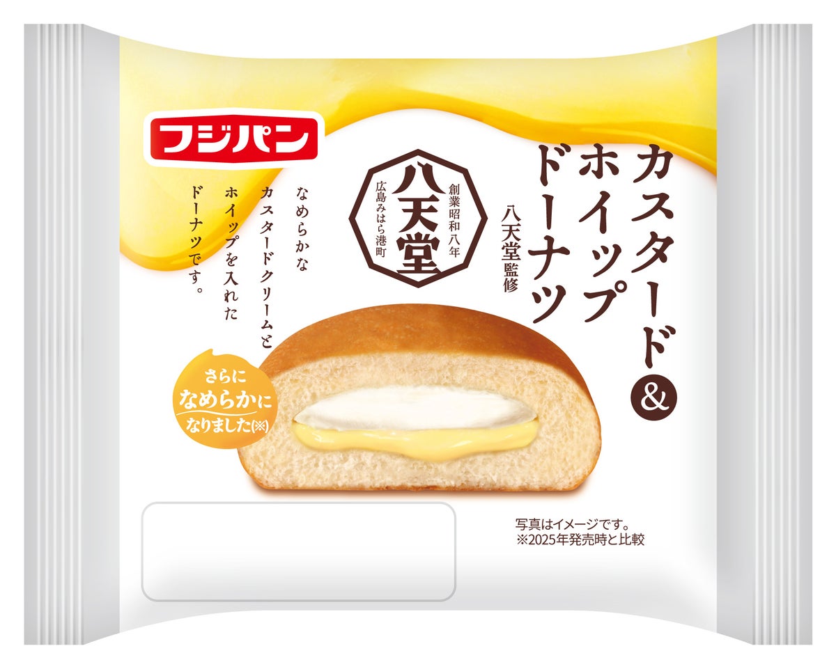 フジパン株式会社(愛知県名古屋市)は、株式会社八天堂(広島県三原市)監修の『カスタード&ホイップドーナツ』『スナックサンド カスタード&ホイップ』『スナックサンド チョコ&ホイップ』を2026年3月1日(日)より新発売いたします。
