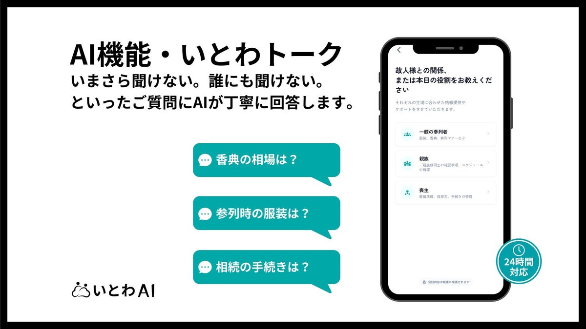 itowaは2023年6月よりサービス提供を開始した葬儀社向けデジタルプラットフォームです 。Web訃報配信、デジタル記帳、供花・弔電のオンライン注文機能に加え、24時間対応のAI「いとわトーク」などの機能を備えています。