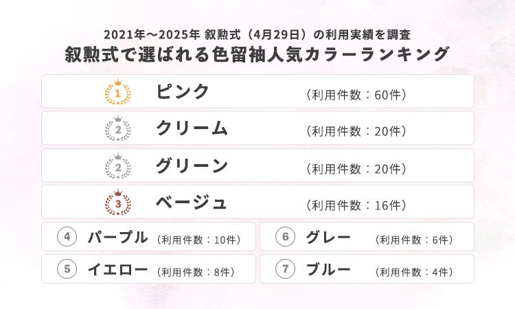 留袖レンタル専門店「マイセレクト」は、2021年から2025年の叙勲式(4月29日)利用実績144件を分析し、色留袖の色別利用傾向を公開しました。