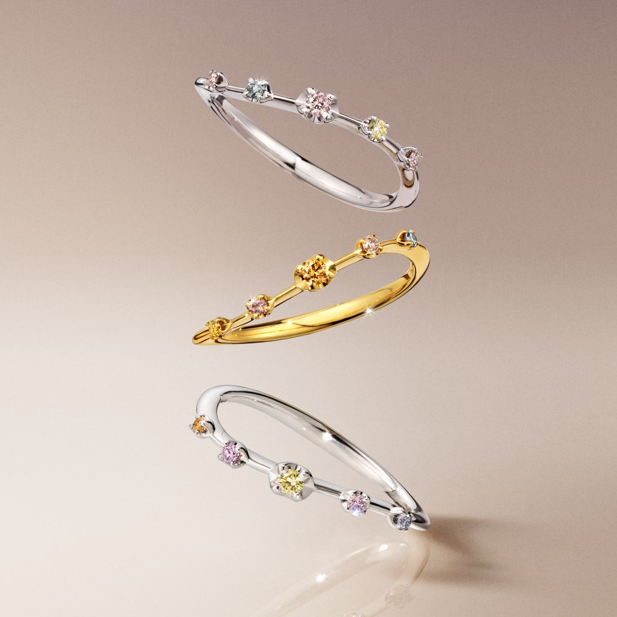 また、「ファンシーカラーダイヤモンド リング・デリヴレール」も数量限定販売いたします。5石の天然カラーダイヤモンドを星座のように連ねたリングは、すべて異なる色をもつ希少なカラーダイヤモンドを、デザイナーが一石ずつ選び抜き配色しています。