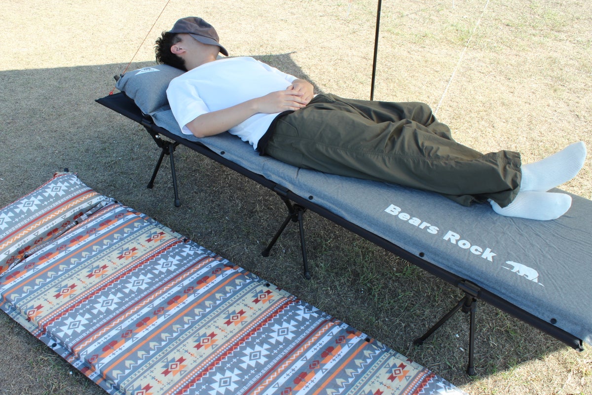 冬キャンプでは、コット(簡易ベッド)を使う人も増えています。