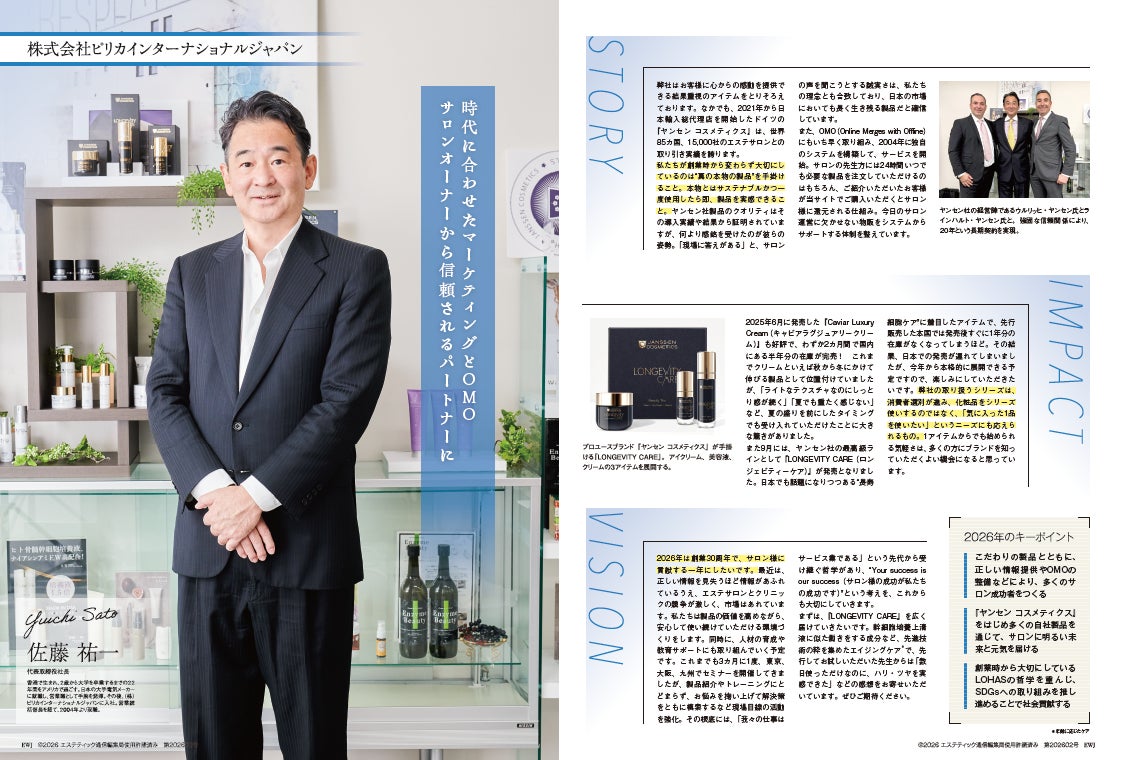 長年にわたりエステティック業界と真摯に向き合い、製品・サービスを通じて業界の発展に寄与してきた歩みとともに、次の時代を見据えたビジョンを提示する内容となっており、エステティック業界のさらなる飛躍を予感させるインタビュー特集として掲載されています。