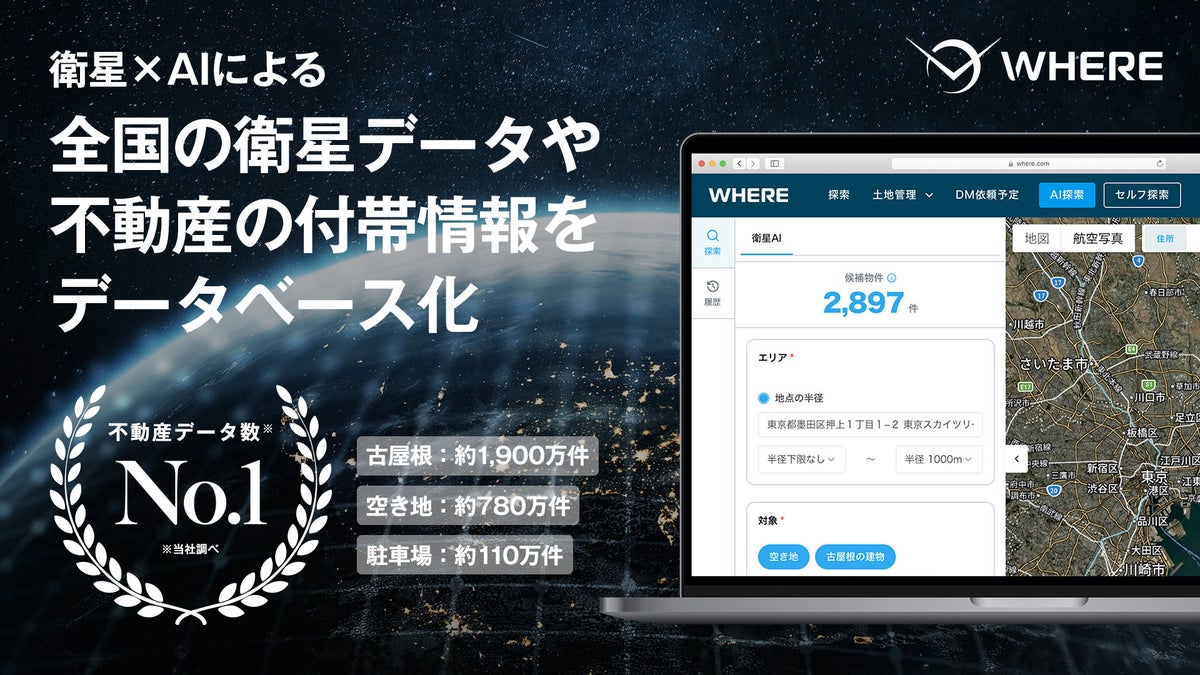 地権者とつながる不動産AIツール『WHERE』、全国の衛星データと不動産情報約7,300万件をデータベース化。条件に合う候補物件数を最短1秒で可視化