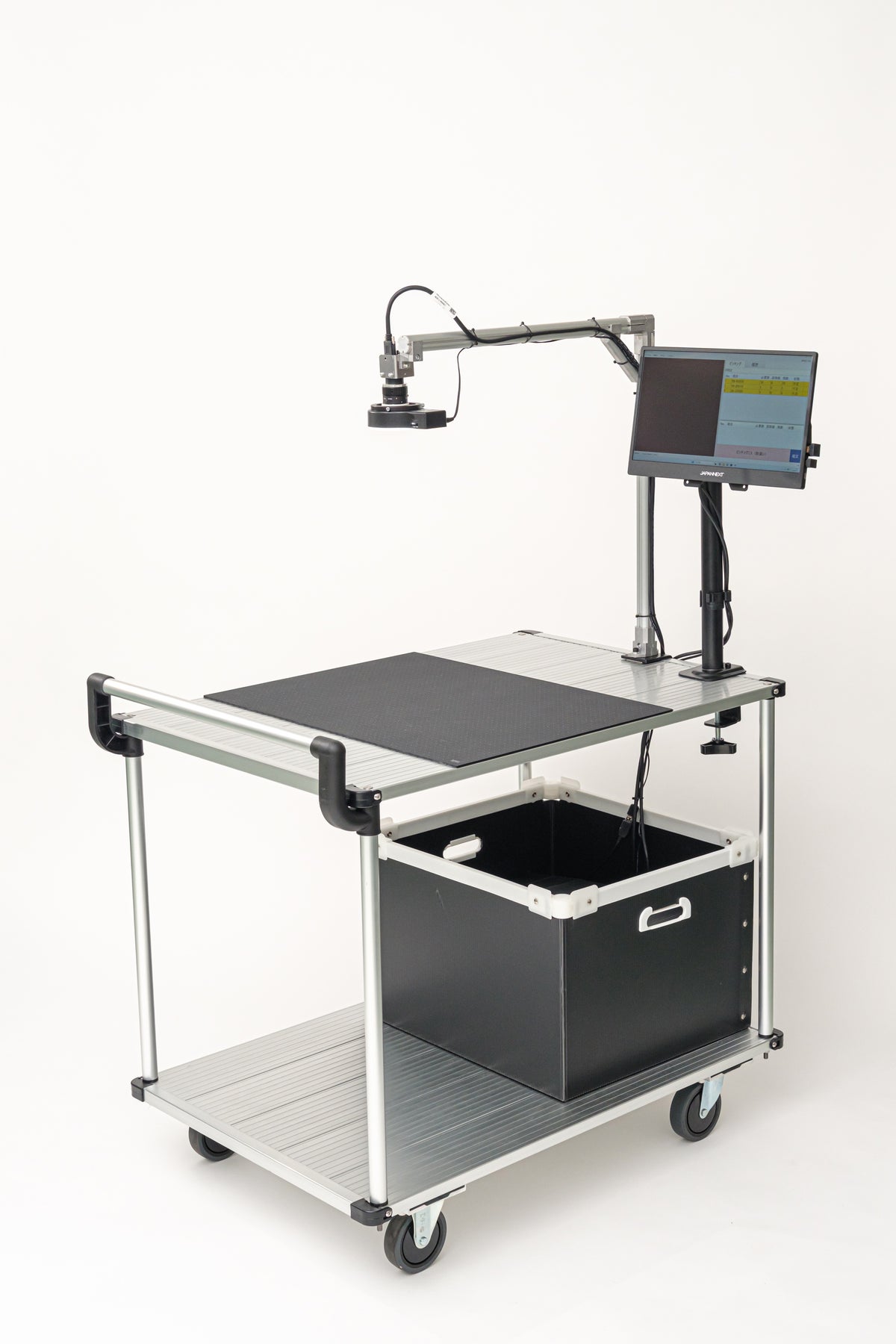 物流倉庫におけるピッキング作業の効率化と精度向上を実現するピッキングカートです。ピッキングリストのバーコードを読み取ることで、集めた部品や数量が指示内容と一致しているかをカメラで読み取り、その場で自動検品、誤出荷を未然に防止します。