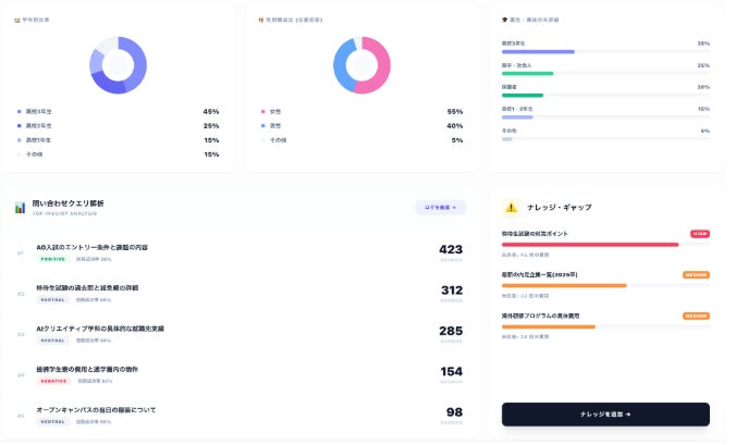 特長4.:志願者の「本音のニーズ」を可視化し、広報戦略をアップデートAIとの対話ログから、高校生や保護者が本当に気にしている点(入試の不安、学費、卒業後の進路実績など)を匿名性を担保したままデータ化。可視化されたニーズに基づき、資料やイベントなどのコンテンツを改善する、データドリブンな募集広報を可能にします。