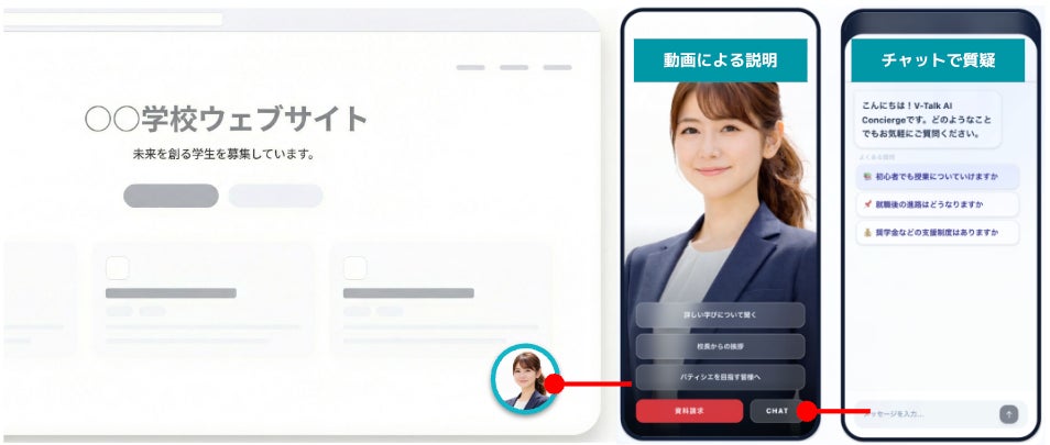 「V-Talk for School」は、学校法人のホームページにコードを埋め込むだけで、スマホサイズの動画プレーヤーとAIチャットボットをポップアップ表示させるSaaS型ツールです。