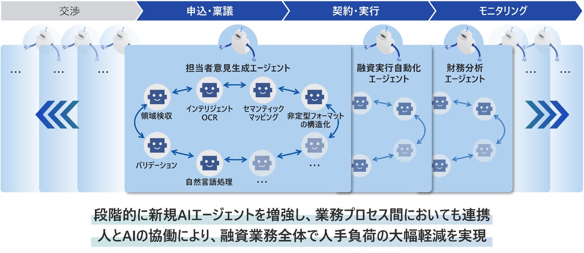 具体的には、与信稟議を上申するための担当者意見の作成、融資契約後の実行事務作業、モニタリング時の財務分析など業務プロセス単位で、それぞれの業務特性に応じたAIエージェントを適用し、自律化に向けた検証を進めています。