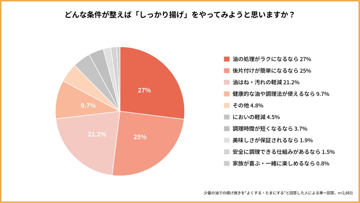 揚げ物をよくする層の55.6%が「後片付けを楽にしたい/油はねを防ぎたい」と感じており、揚げ物のハードルは味よりも「油の扱い」や「片付け負担」にあることがうかがえます。さらに、普段は揚げ物をしないものの「揚げ焼きはよく/たまにする」層でも、46.2%が「後片付けが楽になる/油はねを防げるなら、しっかり揚げをしたい」と回答しました。揚げ焼きを選ぶ理由は、揚げ物そのものが嫌いだからではなく、後片付けへの懸念が大きいことが示唆されます。