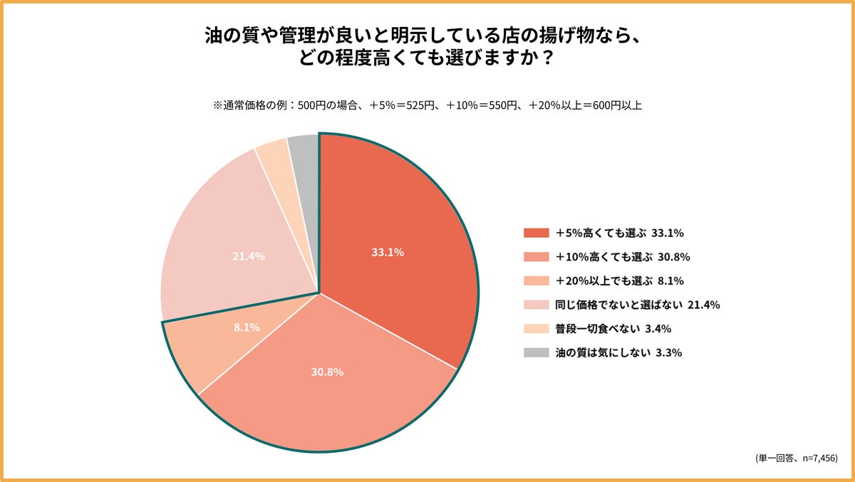 油の質や管理が良いと明示している店の揚げ物について、約72%が価格プレミアム(=相場より高くても選ばれる上乗せ分)を許容すると回答しました。