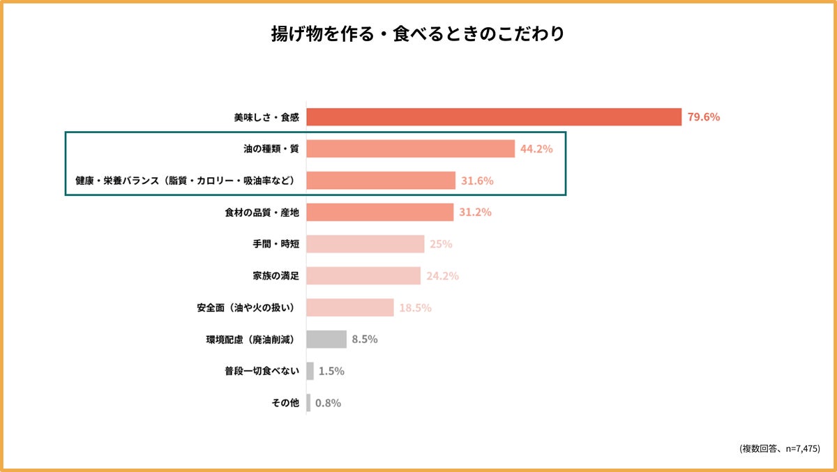 今回の調査から見えてきたのは、消費者の価値観が「価格重視」から「品質・健康重視」へとシフトしている現実です。特に着目すべきは、揚げ物に対するこだわりとして「油の種類・質」が44.2%で第2位にランクインした点です。さらに、「健康・栄養バランス(脂質・カロリー・吸油率など)」も31.6%と約3人に1人が重視しており、消費者は単に揚げ物が食べたいだけでなく、どんな油で、どのように揚げられているかまで意識する傾向がうかがえます。