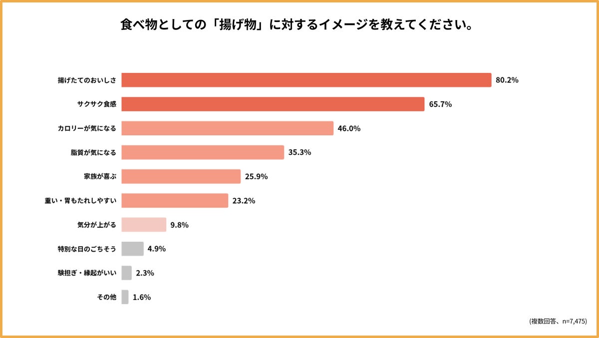 一方で、揚げ物自体への好意度は高く、「揚げたてのおいしさ」や「サクサク食感」に魅力を感じる人が多く存在します。