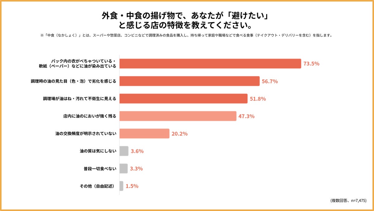 外食・中食の揚げ物で「避けたい店」の特徴として、以下が上位に挙がりました。パック内の衣がべちゃついている・油が染み出している: 73.5%