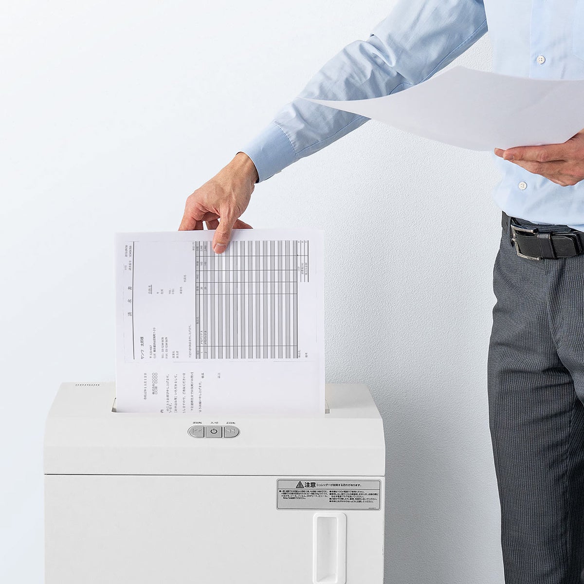 本製品はA3対応のワイド設計。投入幅31cmで、A3用紙を折ることなくそのまま細断できます。図面や設計資料、販促ポスターなど、大判書類を扱うオフィスでもストレスなく処理が可能。書類を折る手間が省けることで業務効率が向上し、日々の作業時間短縮にも貢献します。