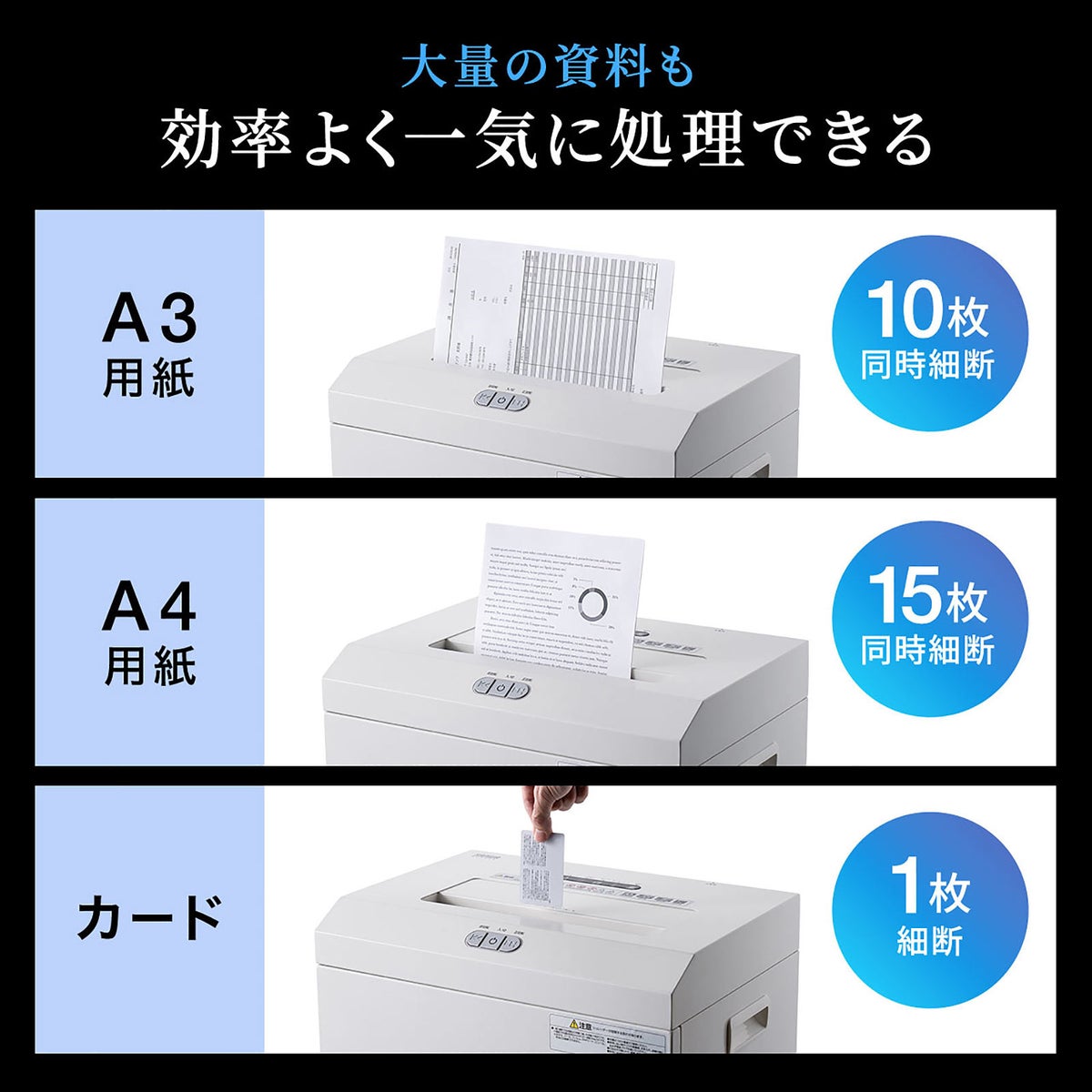 電動シュレッダー 業務用 マイクロカット A3対応 大容量 A4最大15枚同時細断 A3最大10枚同時細断 30分連続細断 カード細断 ホッチキス対応 40L 静音 キャスター付き
