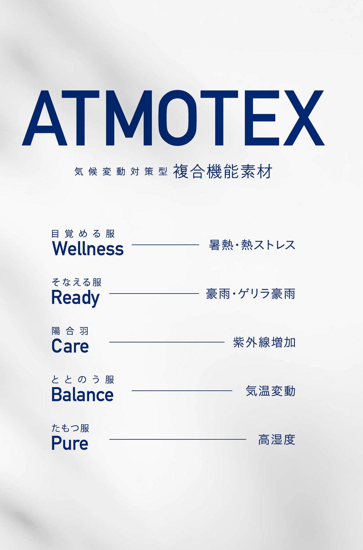 猛暑、ゲリラ豪雨、紫外線増大など、データで可視化された現代の「暮らしの困りごと」に 対し、衣服を通じた具体的な解決策(ソリューション)を提案します 。複合機能型ブランドを 起点に、5つの気候リスクに対応したサブブランドを展開いたします。専門的な根拠と使用者視点の 実用性を融合させ、生活者の健康と暮らしを守る次世代のアパレル製品をぜひご体感ください。