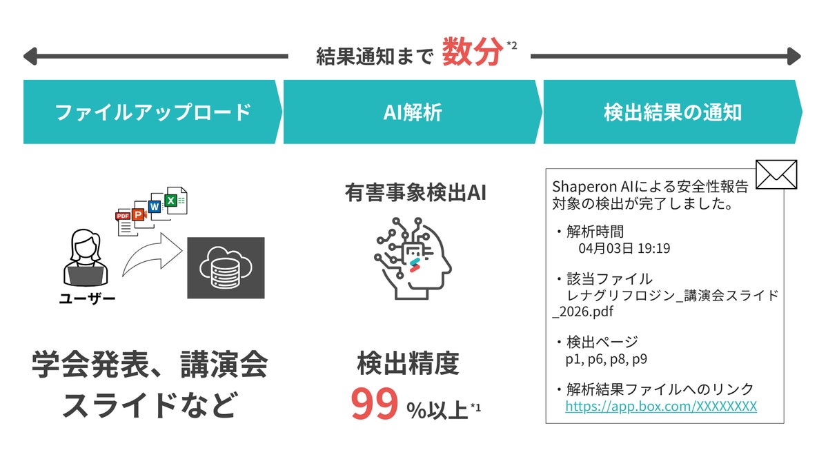 本サービスは、講演会スライドや学会発表資料などから、AIが有害事象の有無を99%以上(*1)の精度で自動判定するソリューションです。従来、人の目視に依存していた確認作業をAIが高度に補完。1ファイルあたり10分以内(*2)での高速検知により、報告漏れリスクの極小化と、確認工数・外部委託コストの削減を同時に実現します。