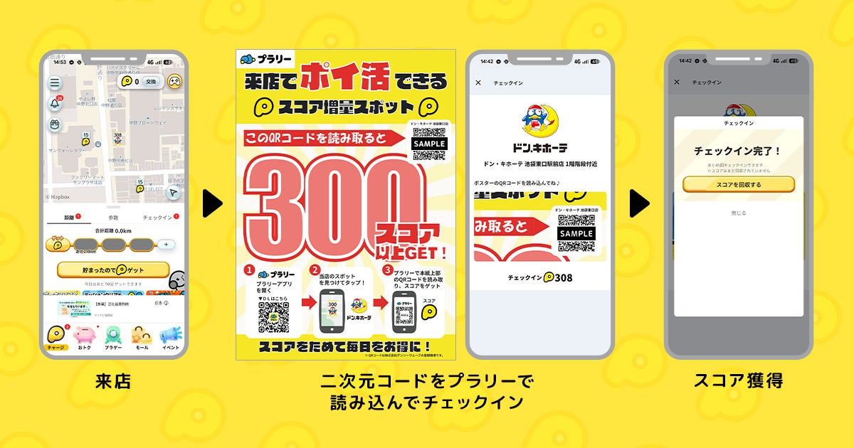 本取り組みでは、ドン・キホーテ 池袋東口駅前店、ドン・キホーテ 錦糸町北口店、ドン・キホーテ 中野駅前店の3店舗を対象に、『プラリー』上でプレミアムチェックインスポットとして展開します。各店舗のチェックインスコアを通常の約20倍にあたる300スコアに設定し、店内に設置された二次元コードを読み取ることでチェックインが完了する仕組みです。本実証実験を通じて、ユーザーの来店促進および購買行動の活性化を図るとともに、店舗側においては来店状況や顧客傾向の可視化を可能にし、データに基づく販促施策の検証を進めます。これにより、リアル店舗におけるリテールDXの推進を目指します。