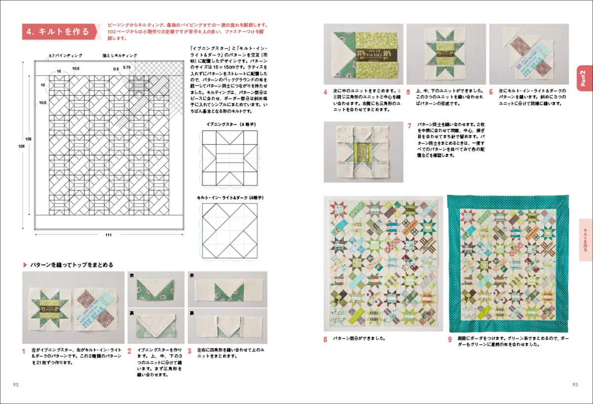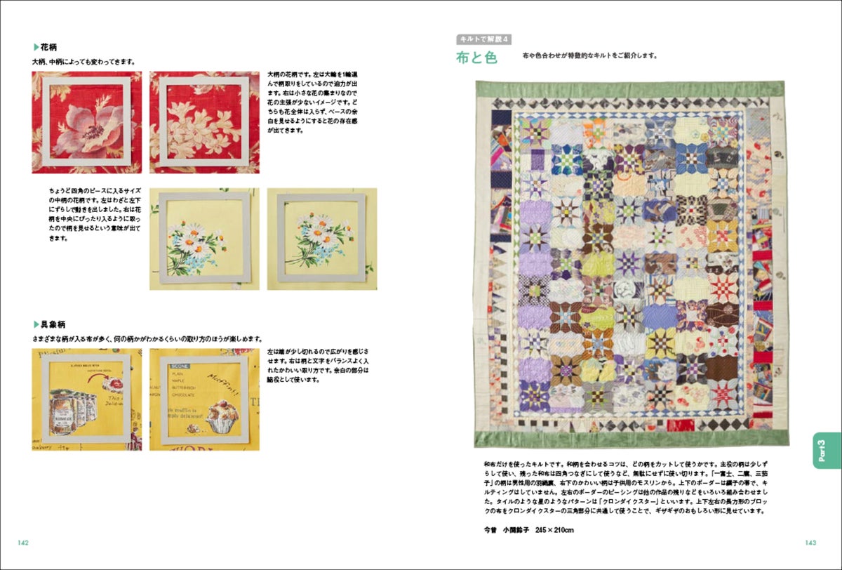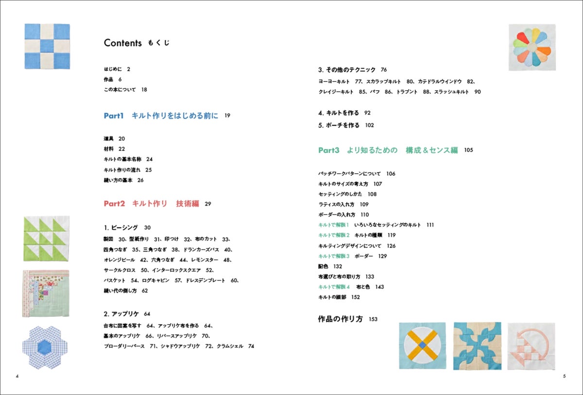 はじめに、作品Part1 キルト作りをはじめる前に/道具、材料、キルトの基本名称、キルト作りの流れ、縫い方の基本Part2 キルト作り 技術編/ピーシング、アップリケ、その他のテクニック、キルトを作る、ポーチを作るPart3 より知るための 構成&センス編/パターン、サイズ、セッティング、ラティス、ボーダー、キルティングデザイン、配色、布選びと布の取り方、キルトで解説作品の作り方