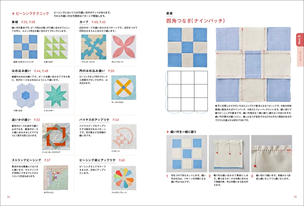 本書では、正確にパターンを縫うための必須技術はもちろん、面白い技法まで網羅し、小関先生ならではのセンスの良さで提案しています。さらに、キルトデザインの根幹となる基本の考え方から、実際の作品を用いた応用編の解説まで、役に立つ情報が満載です。
