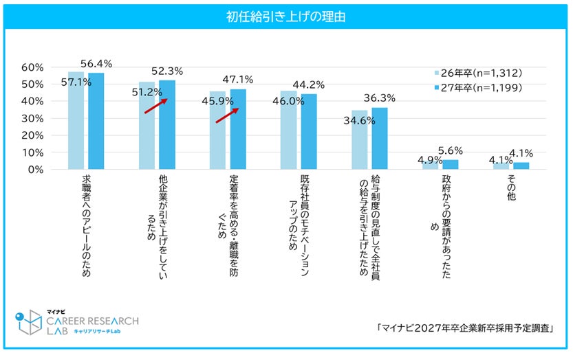 初任給(学卒生・支給額)の平均額は27年卒全体で234,223円となり、26年卒から8,437円増加したものの、学生の理想の平均初任給額は28.8万円※で、希望額には及ばない結果となった。引き上げの理由で最も多かったのは前年同様「求職者へのアピールのため」(56.4%)だった。次いで多かった「他企業が引き上げをしているため」(52.3%)や「定着率を高める・離職を防ぐため」(47.1%)は前年から増加しており、他企業との待遇面における差別化や、それによる人材流出の防止という観点から引き上げを行う企業が多い。【図3、4、5】